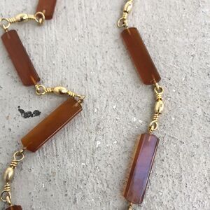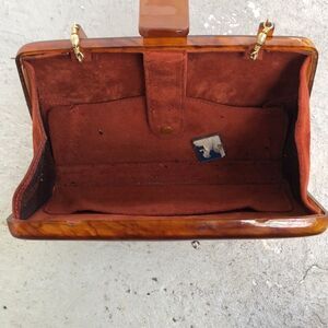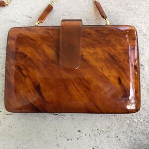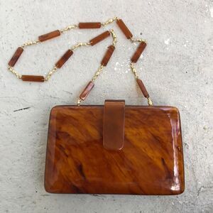 Amber colored. It is in good condition, but not perfect so please check the pictures. The sidewalls of the interior are peeling that could be straight down. There’s of some sort of stuff to the bottom and I have not removed it because I do not want to tear it. Chain is in perfect condition. Measures approximately 8.5 x 5.5 x 1.5. Chain drop is 16.