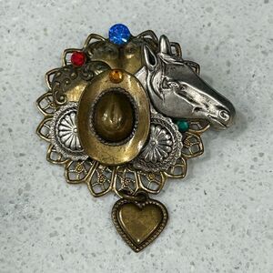 Vintage charm meets rodeo flair in this 2”H x 1.5”W brooch pin. Crafted with a silver and gold-tone finish, it features a heart charm with a roll-over clasp closure. The 3D design includes a pewter morgan horse, a gold-tone hat, and a heart charm set on a geometric radial base, adorned with 4 multicolor rhinestones for added sparkle.