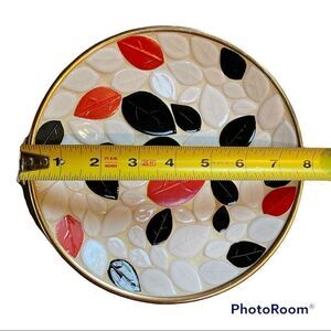 Such a pretty item. 1960s mid century modern handmade decorative ivory colored plaster plate with geometric orange/red, white and black leaves with a copper back and rim. Great vintage condition - there is a slight discoloration on the plaster in one area (see last pic) and copper is a little scratched on the back.