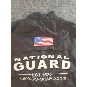 A classic black windbreaker with a full zip, this vintage National Guard jacket is a size large. Perfect for lovers of military style or collectors of vintage pieces.