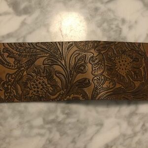 The vintage belt is in mint condition. It is tooled leather on one side and suede on the other. The belt loops through two O rings to buckle. This belt is definitely super high quality! It is approximately 34” long.