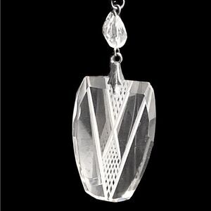 Stunning pair of engraved glass crystal Art Deco design with beveled edges. The crystal is from the Victorian deco period snd haz been made into earrings with modern components in the 1980’s. Beautiful elegant with shine, Shepard’s hooks with a crystal spacer. The earrings measure 3” in length. Beautiful, elegant and unique.