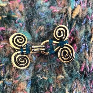 This has a variety of colors that are muted with a little bit of gold threading. It’s a great oversized sweater. Measuring seem to see him across the shoulders is 19.5 measuring pit to pit is approximately 23.5 on the top of the shoulder to the bottom of the sweater is 25 lightweight wool n mohair.