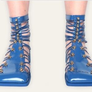 #VivienneHu #DesignerShoes #CobaltBlue #PatentLeatherSandals #GladiatorBoots #BoldFashion #RunwayShoes #HighFashionFootwear #StatementShoes #LuxuryStyle #FestivalFashion #NYFWLook