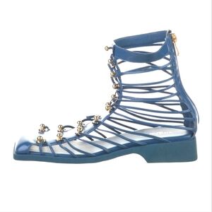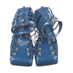 Striking and rare cobalt blue gladiator sandals by luxury designer Vivienne Hu. Made from glossy patent leather with gold dome studs, lace-up design, and sculptural silhouette. Fierce runway energy meets high fashion craftsmanship.