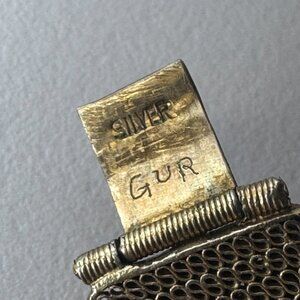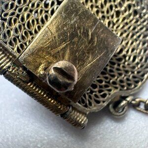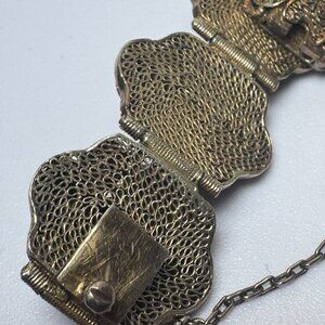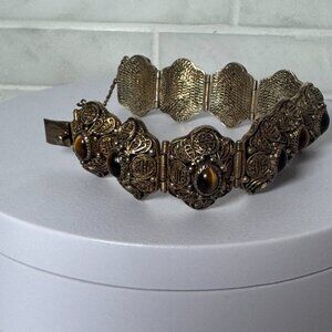 Vintage Chinese export bracelet , featuring intricate filigree designs and tiger's eye cabochon. Consists of 10 panels, marked silver GUR on the secure clasp with safety chain.
