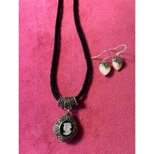Vtg Sterling 925 Cameo Marcasite Reversible Pendant & Mother of Pearl Earrings