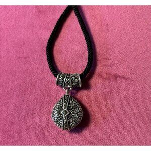 The product is a vintage sterling silver necklace featuring a cameo design with marcasite and reversible pendant, paired with mother of pearl earrings. The pendant is reversible, allowing for a different design to be showcased depending on the wearer's preference. The combination of the unique cameo design, marcasite detailing, and mother of pearl accents make this piece a timeless and elegant addition to any jewelry collection.