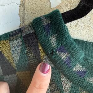 Grandpacore 90s sweater from Tundra Canada. Made with 100% soft merino wool in a classic shape, this crewneck pullover is breathable and warm, dressing up or down without bulk. Earth tone geometric pattern on a forest green base. This one is a banger.