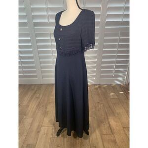 Beautiful navy blue viscose/linen blend empire waist A-line cocktail dress. Tea length, scoop neck, lightly padded shoulders. Deadstock/new with tags. 9/medium