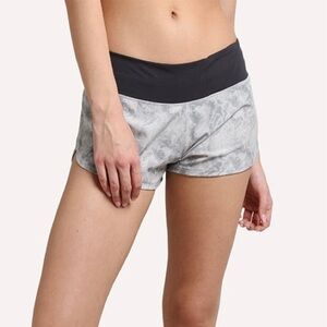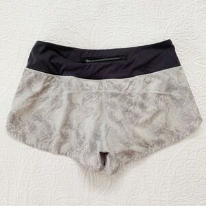 Marked size Small - measures approximately 14.5" across waist, 11" front rise, 2.75" inseam, 12.5" across leg opening. Grey marble print.