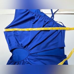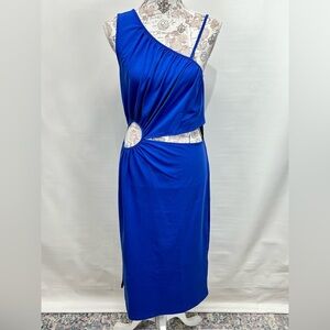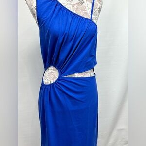 Royal blue one shoulder cutout dress from WALTER BAKER, size L. Dress has thin strap on open shoulder, 2 cutouts at waistline and is midi length.