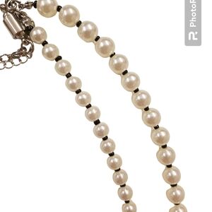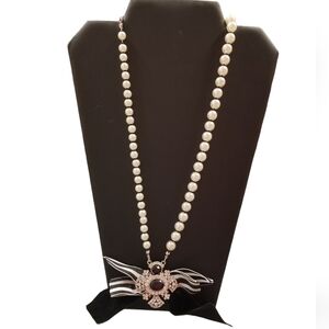 Lovely necklace by White House Black Market features a faux pearl necklace with black ribbon pendant with glass rhinestone crystals. Necklace measures 26-1/2 inches in length. Great condition