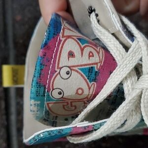 excellent condition, like new, eclectic, blue, black, cream purple, maximalism high boots, unique quirky rare, punk, pop, creativity