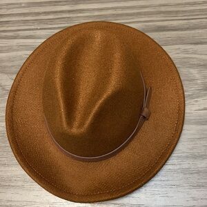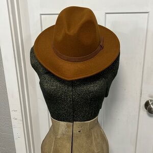 Polyester/wool blend boutique western style brown hat in new like condition. One size fits most has adjustable cinching string inside of hat. Please check out all pics and measurements and comment below with any questions