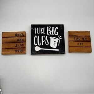 Wall plaque with ring for hanging with a cooking/drinking theme stating, "I LIKE BIG CUPS". Coordinating coasters, that state, "don't ask just pour" and "top me off" that could also be hug by adding rings or displayed on a backslash or plate shelf.