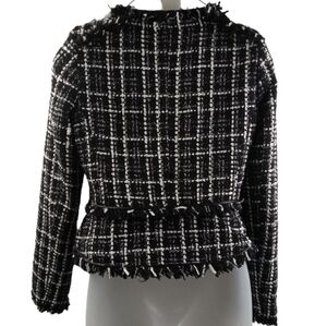 Chic and timeless Walter Baker tweed cropped jacket featuring a black and white check pattern with metallic threading for a luxe finish. Detailed with statement gold buttons, a frayed hem, and front slip pockets for added style. Perfect for pairing with skirts, trousers, or denim for a polished look day or night.
