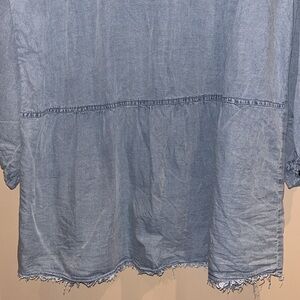 Measurements 23 1/2 inches pit to pit flat back, 33” inches shoulder to hem. Drop puffy sleeves from shoulder to cuff is 25”. Cute washed out denim look mini dress or Tunic with leggings. Nice fabric, all buttons work. Smoke and pet free home. Freshly washed, air dried and ironed for pics. No idea on manufacturing company. Raw sewn edge , part of the style. Pockets are great size. Small white spot, on back upper centered as pictured.