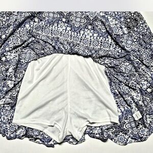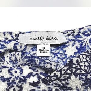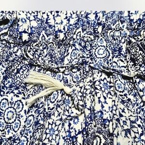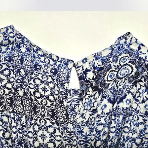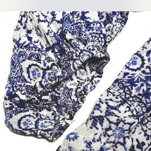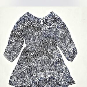 Stylish bohemian dress with a blue and white floral design. Features a flowy silhouette and long sleeves.