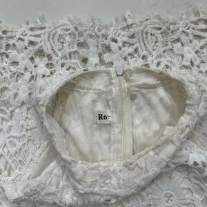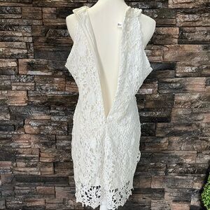 This sleeveless white sheath dress features a halter neckline and a sophisticated midi length, perfect for bridal occasions. The intricate floral lace pattern adds a touch of elegance, while the scalloped hem detail enhances its romantic appeal.