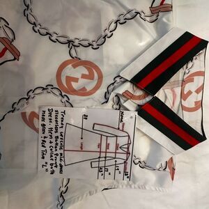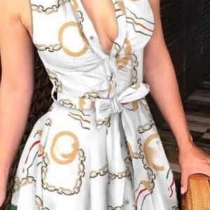 Turn heads with this chic white mini dress featuring a stylish gold chain print. Perfect for any occasion, this dress offers a blend of elegance and modern flair. Missing belt