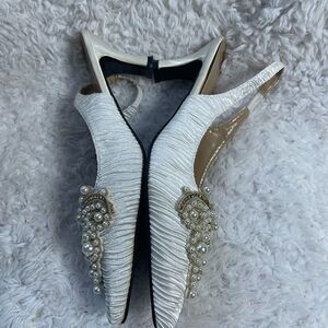 Whittall Shon fabric off white satin scrunch White Pearl Embellished Shoes SZ12