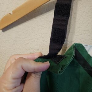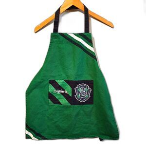 The Williams Sonoma HARRY POTTER Hogwarts SLYTHERIN Apron is a stylish and comfortable chef apron for kids, featuring a green and black striped design with the iconic Slytherin house crest from the Harry Potter series. Made from 100% cotton, this machine washable apron is perfect for young fans of the Harry Potter books and movies. With its one size fits all design, this apron is suitable for both boys and girls who love to cook or bake, adding a fun and personalized touch to their culinary adventures. Pre-owned