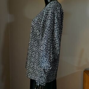 Silver and black print top with a boat neck and fitted at the wrist sleeve. very versatile. can be worn during the day or dressed up for an evening out. The silver thread in the design has a silky look to it.