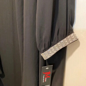 Womens new with tags, formal black 2 piece gown. The under piece is the dress which is sleeveless and 56 inches from shoulder to end. The pit to pit front is 23 inches and the hip measurement is 26 1/2 inches. The fabric does stretch. The second piece is a light outer layer with two cold shoulder areas, one for the upper and one for the lower arm. The fabric is sheer on the arms with exquisite rhinestones, wrapping the wrists. It is marked an XL but based on the measurements, I think that many XXL would be happy with the fit as well. The measurements will help you decide. The dress is a pullover stretchy dress. This will be a very comfortable lightweight formal dress made out of polyester. Thank you for considering my item 🌷