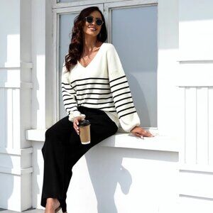 Highlight Design The V neck knitted jumpers feature with a comfortable neckline and classic stripe. The sweater pants designed with a straight leg fit with a subtle flare at the hem and a fitted elastic waistband. Keep you feeling comfy and cozy without compromising on style.