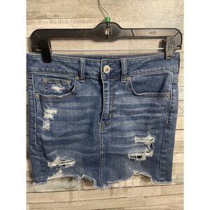 Women’s American eagle high-rise mini skirt medium wash distressed size 4.