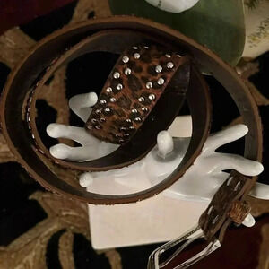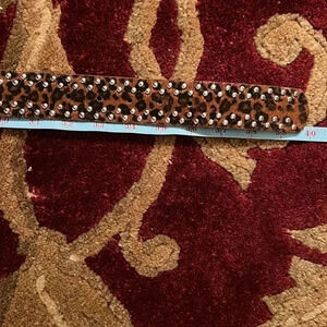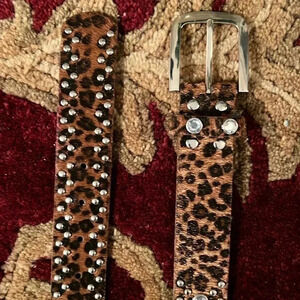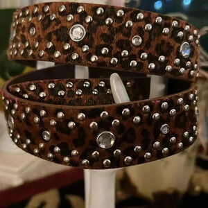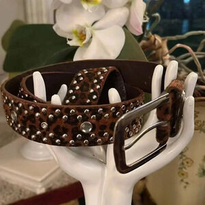 Women’s Black Brown Animal Print Fur-Feel Vegan Leather Belt with Silver Tone Buckle adorned with Rhinestone Stones and Studs in great pre-owned condition. No missing studs or rhinestones.