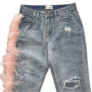 Women's Blue Distressed Ankle Length Jeans(Size Large) Zipper Closure, Faux detail.Approx measurements Waist 28" Length 33", Rise 11", Inseam 22".NWOT