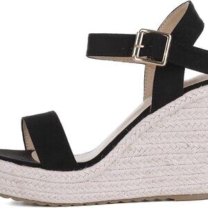 Features: These stylish wedge heels feature a comfy platform and a high slope heel, making them great for adding some height and flair to your outfit. The open-toe design with an adjustable buckle ankle strap ensures a secure fit. The faux suede upper is easy to clean, and the woven outsole adds a fun, textured touch.