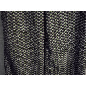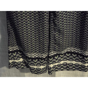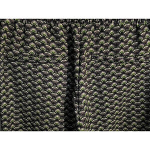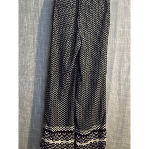 These are pre-owned H&M pants, size US 2. The pants feature a black, green, and white geometric pattern throughout. They have an clasp and button waistband and a straight leg cut. The hem of the pants has a decorative border pattern. There are no visible stains, tears, or other significant imperfections. The material appears to be a lightweight, possibly synthetic blend..
