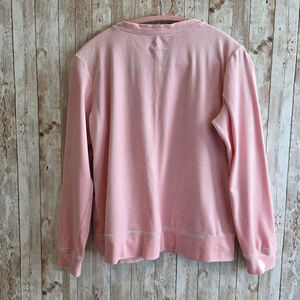 This is a pre-owned MUK LUKS sweatshirt, size small. The garment is light pink and made of 95% polyester and 5% spandex. It features a crew neck with a stitched V detail. The cuffs and hem are ribbed. There are no visible stains or tears. The sweatshirt is in good condition.