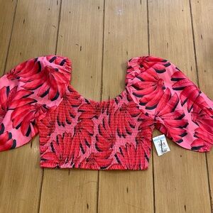 Women’s Pink Tropical Banana Print Smocked Crop Top HT360 Summer Resort wear XL