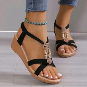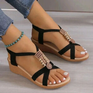 Women's Style Beaded Wedge Sandals, Summer, Medium Heel, Black Color