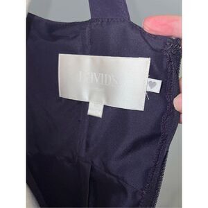 By Davids Bridal. It has steel boning in the chest piece to hold shape. Back Zipper.
