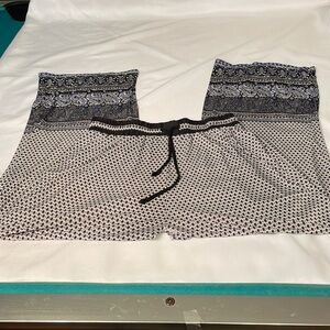 Women’s long Nylon pants size small/medium black white blue pattern drawstring