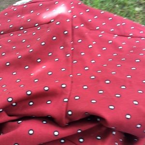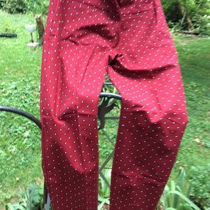 New with tags women’s Express Columnist Ankle  pants.  Super cute pattern of burgundy background with tiny black circles with cream color centers through the pants.  These would look great with a cream or black top. They are fitted through hip and thigh size 00. They are 97% cotton and 3% spandex. The front has slide in side pockets on each side with a short zipper front closure with hook closure and button.  There is a tiny metal key type hook on the front that might hold keys or something lightweight. The back has horizontal slide in pockets.