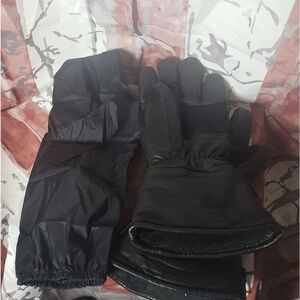 Pre-owned excellent condition insulated long Small black leather gloves fits up to medium. Each glove has nylon cover as shown inside zipper. Suede section on palm.