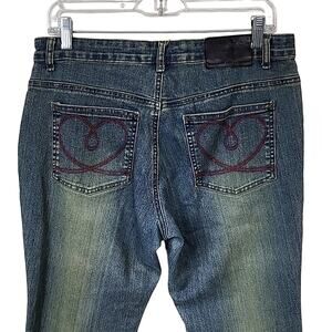 Vintage 1990's jeans by Joe Boxer. These babies have velvet studded floral accents on the legs and embroidered hearts on the back pockets with an overall acid wash coloring. Made with cotton, polyester and spandex for a stretchy and comfortable fit.