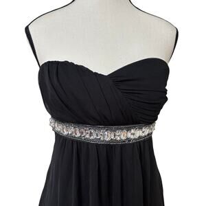 POLYESTER/SPANDEX. STRETY. Black strapless dress with rhinestone belt