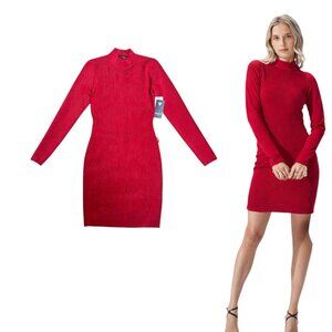 This fun and sexy rib-knit mini dress features a low open back cut-out, mock neckline, long sleeves, a figure hugging silhouette and a GUESS logo gold chain belt.