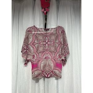 Y2K Sheer Pink Paisley Mesh Rhinestone Top Batwing Embellished Blouse Small INC