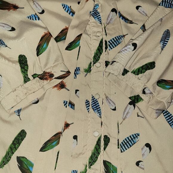 YUMI Tan 3/4 Sleeve Button Up with Tie Sash Feather Print Top/Blouse 6/8