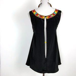 Yoana Baraschi Black Sleeveless Rainbow Beaded Embellished Top Summer Vacation Party. Vibrant, colorful beading all over neckline and armholes. Keyhole cut-out at neckline and back zip.