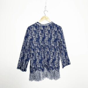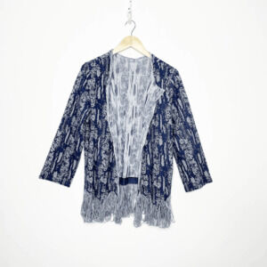 Yon Design Ft. Lauderdale. Womens One size. Denim Fringe open front cardigan. Navy blue. Open front. Looped fringe hem. Pull on closure. All measurements are approximate and taken flat and un-stretched.