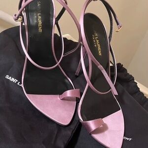 Gorgeous Saint Laurent stiletto satin heels in a soft pink mauve shade.